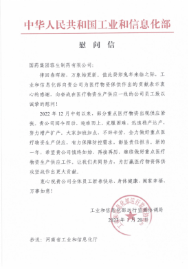 国药容生收到中华人民共和国工业和信息化部慰问信