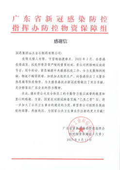 国药金石收到广东省新冠感染防控物资保障组感谢信