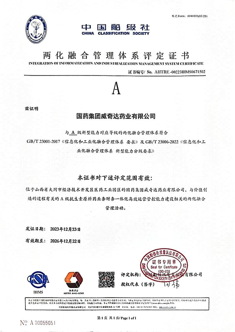国药威奇达于2019年开始系统性推进两化融合管理体系建设,通过公司培训、会议宣传、内外部管理评审等方式,落实了体系标准条款的各项要求,助力公司于2020年顺利通过两化融合管理体系A级评定,此次再评定是公司在推进信息化和工业化深度融合,以及数字化转型升级方面取得新成效。