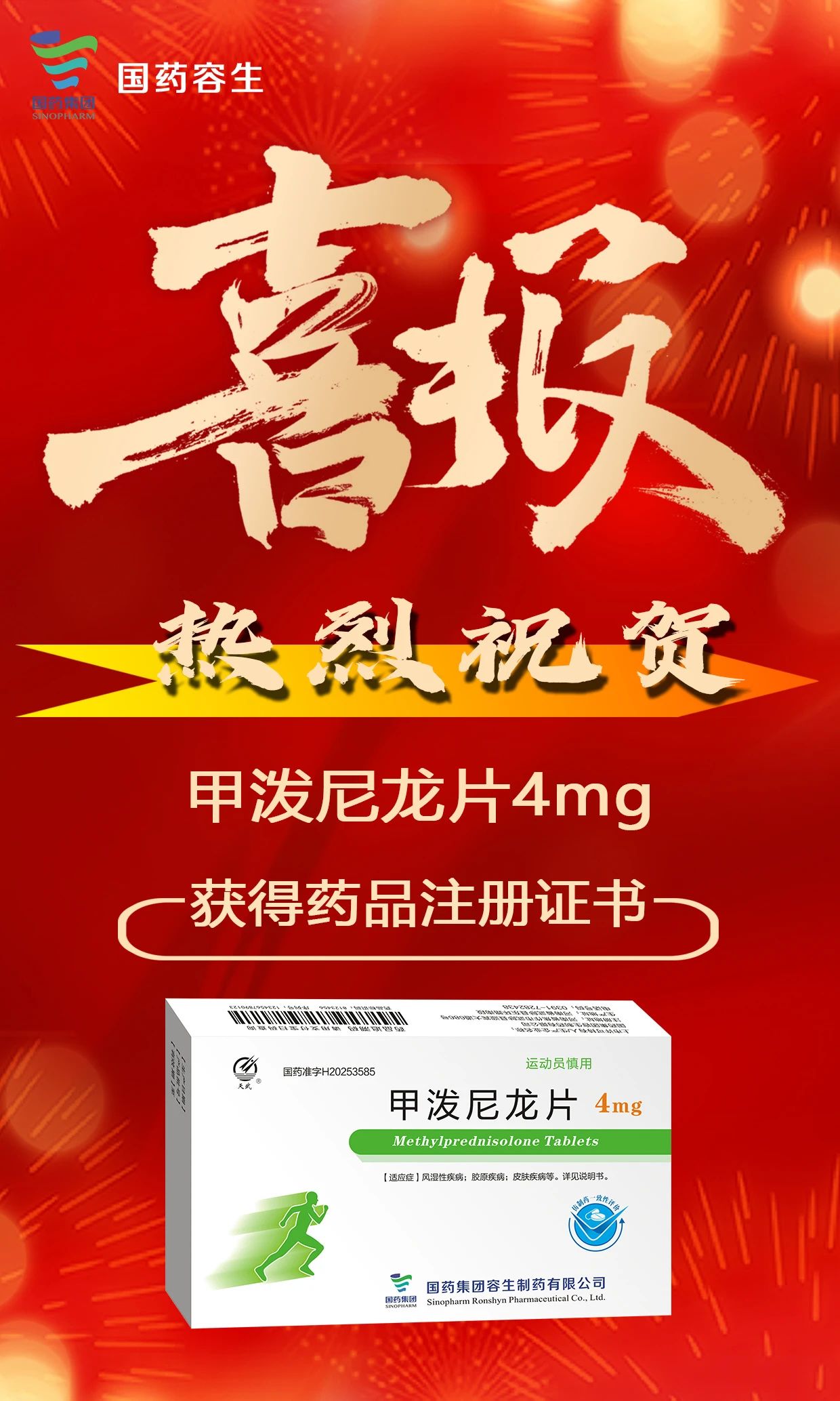 捷报频传,再获佳绩。近日,子公司国药容生收到国家药品监督管理局核准签发的甲泼尼龙片(4mg)药品注册证书(化学药品4类)。