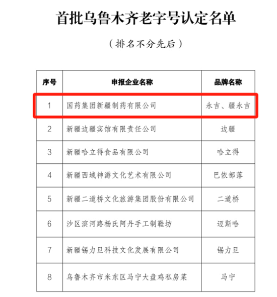 近日,乌鲁木齐市商务局公布了首批“乌鲁木齐老字号”认定名单。子公司国药新疆荣耀上榜,成功荣获“乌鲁木齐老字号”称号。
