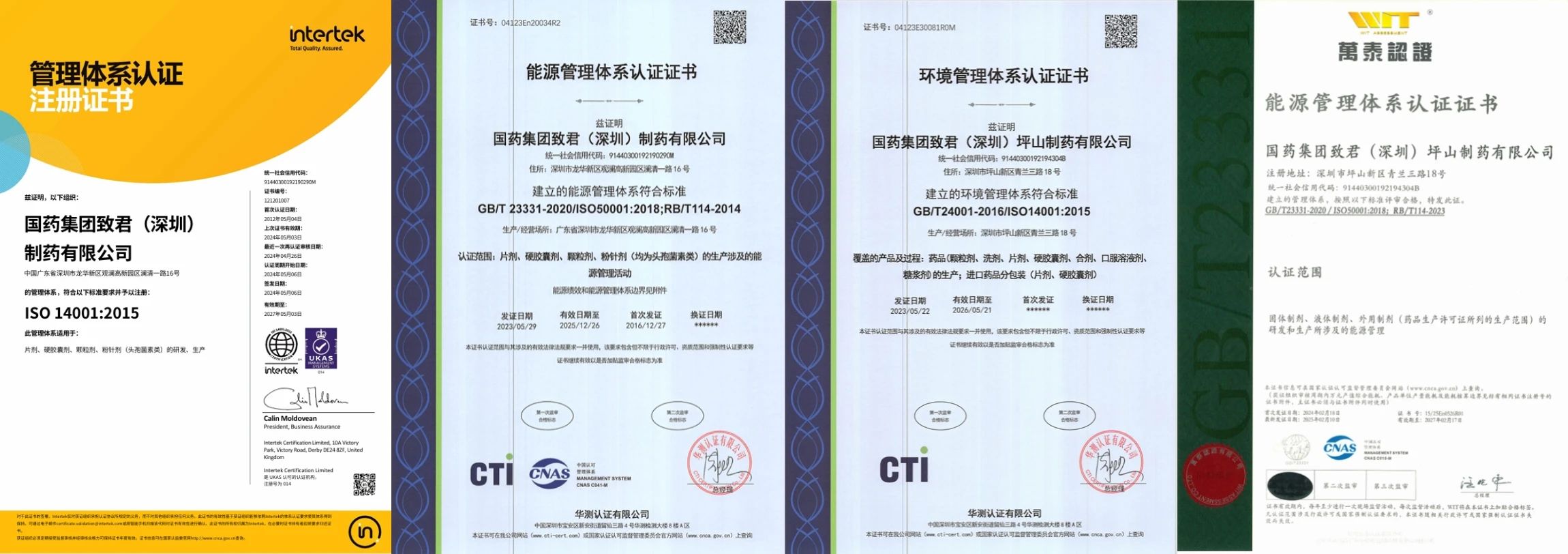 从顶层设计到执行落地,国药致君构建起"三位一体"的绿色管理体系。公司节能环保领导小组每年拨付专项经费,强力推动绿色项目的落地实施。同时,专业团队全程监督环保工作的执行,将“节能降耗、减排治污”的核心理念融入公司管理手册。此外,公司还荣获了ISO14001环境管理体系和ISO50001能源管理体系等权威认证,废水、废气、固废100%规范处理,绿色发展理念贯穿生产全环节。