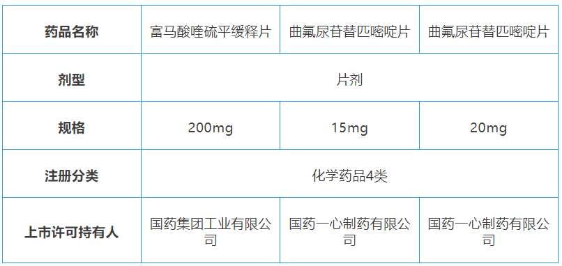 近日,子公司国药工业、国药一心分别收到国家药品监督管理局核准签发的《药品注册证书》,富马酸喹硫平缓释片曲氟尿苷替匹嘧啶片符合药品注册的有关要求,批准注册。