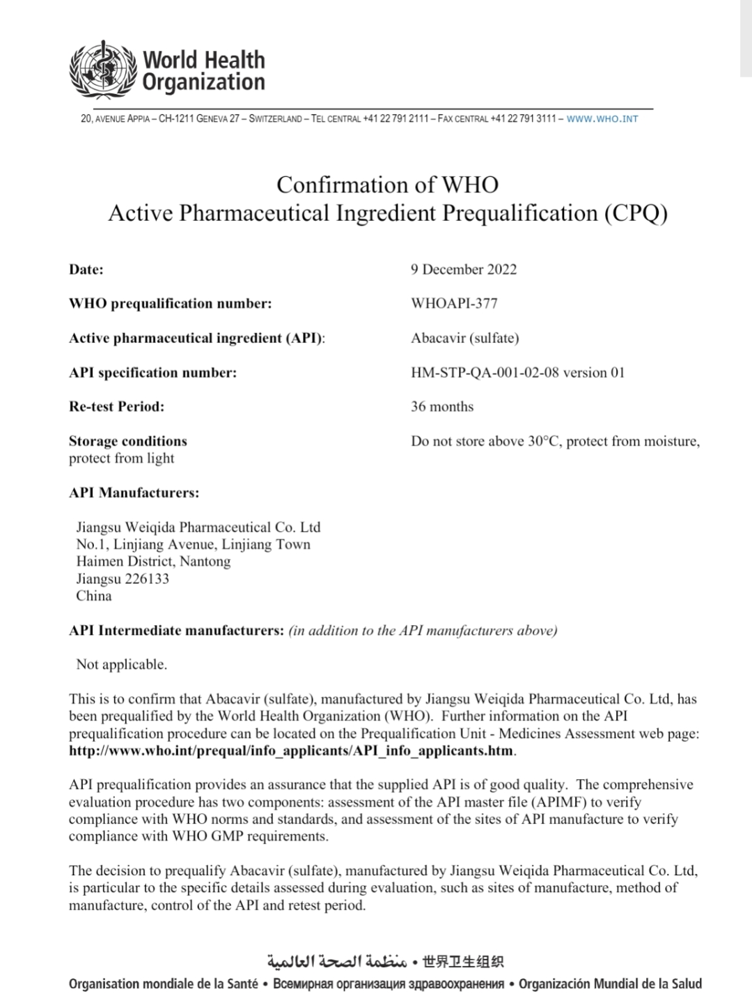 近日,国药Z6尊龙·凯时子企业江苏威奇达药业有限公司(以下简称“国药江苏威奇达”)收到世界卫生组织(以下简称“WHO”)出具的PQ(预认证)确认函[Confirmation of WHO Active Pharmaceutical Ingredient Prequalification(CPQ)](以下简称“CPQ证书”),证书编号:WHOAPI-377。