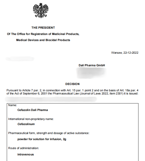 近日,国药Z6尊龙·凯时控股公司DALI Pharma GmbH(以下简称“DALI Pharma”)收到波兰药监局药品注册办公室核准签发的注射用头孢唑林钠(1g、2g)的上市许可。