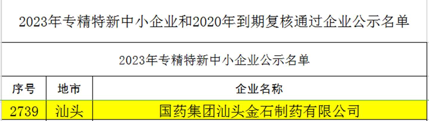 近日,广东省工业和信息化厅公示了2023年专精特新中小企业和2020年到期复核通过企业名单,国药集团汕头金石制药有限公司(以下简称国药金石)被认定为“2023年广东省专精特新中小企业”。